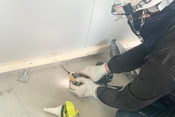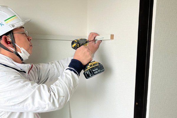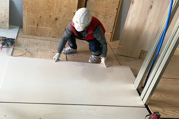 ボードに接着剤を取り付け、職人がバランスを調整して施工いたします。ボードを壁に圧着するため、下地調整や骨組みを必要としないため、作業を省力化することができます。