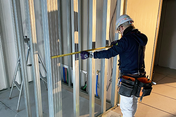軽鉄材と呼ばれる軽量の鉄骨を用いて、天井や壁などの下地を作ります。